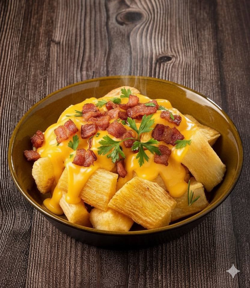 Porção crocante de macaxeira frita com cheddar e bacon em cubos.