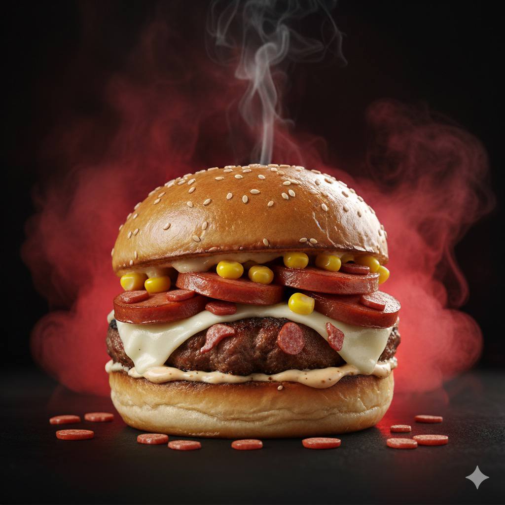 Hambúrguer suculento com blend de carne, salsicha, mussarela e milho.