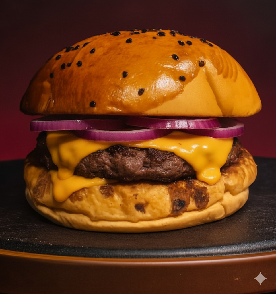 Hambúrguer clássico com cheddar cremoso e cebola roxa — simples e delicioso.