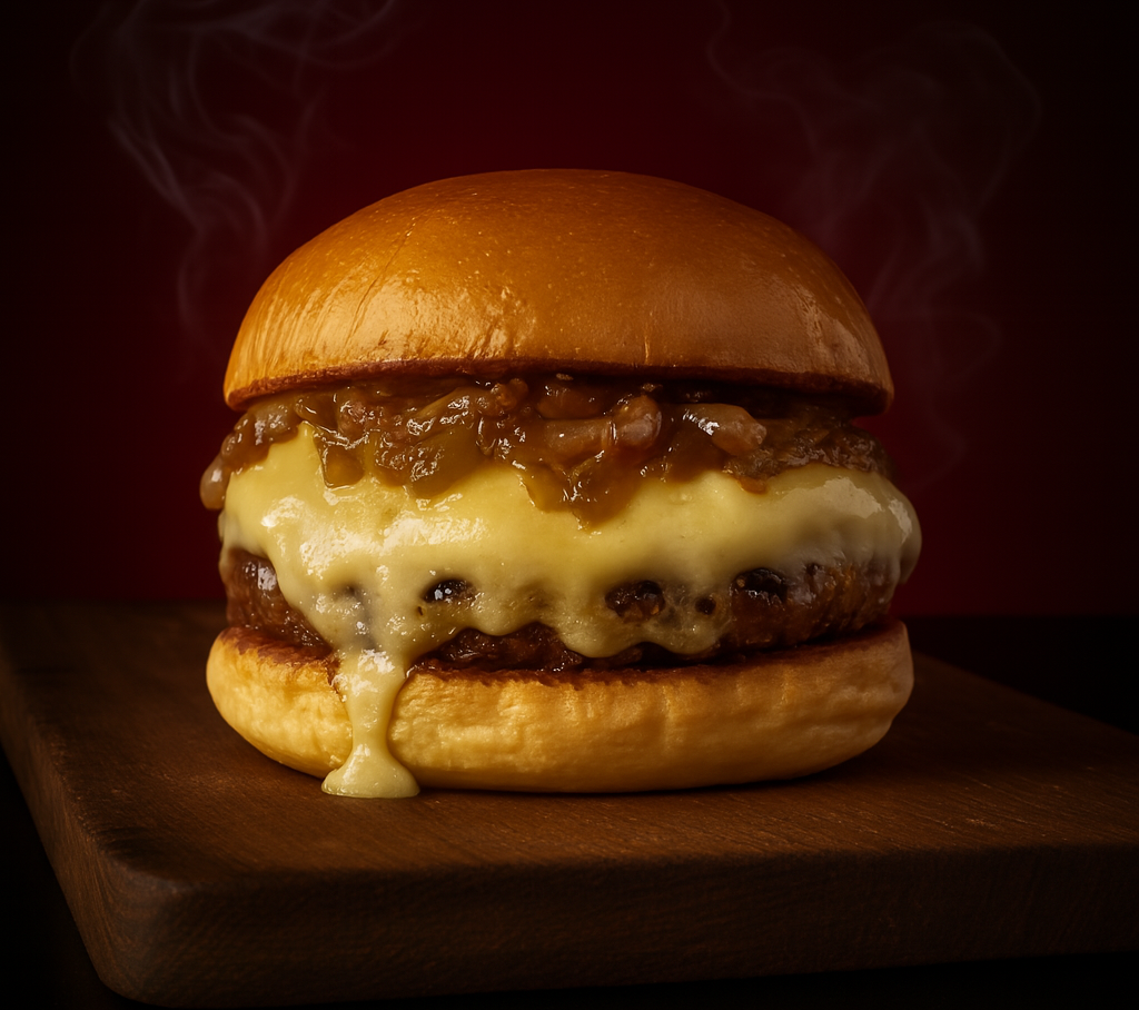Ingredientes: Pão Brioche | 2 Carnes 130g | Geleia de Pimenta | Queijo Mussarela | Cebola Flambada